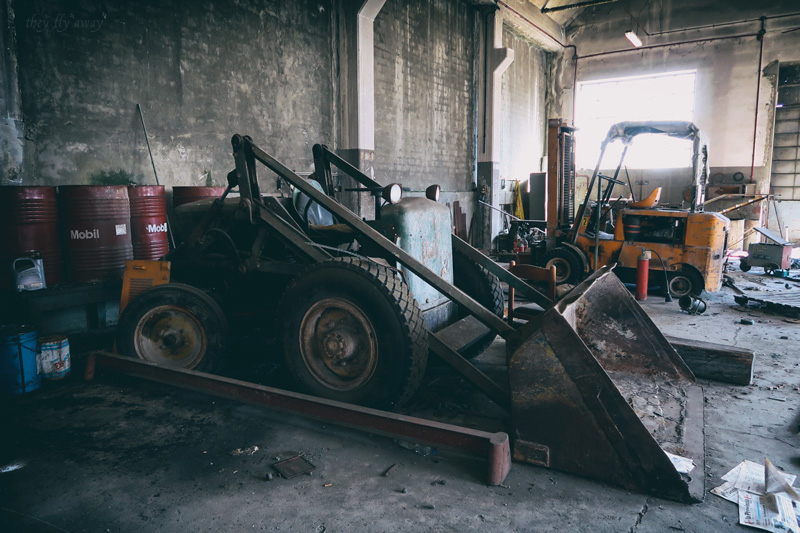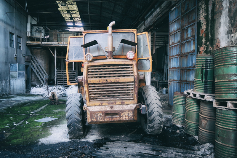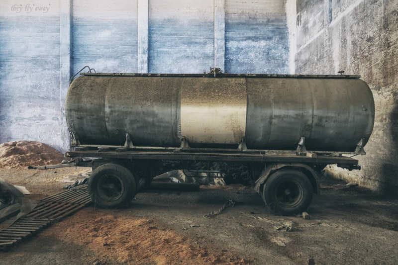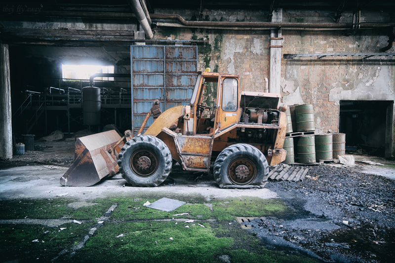 La conferma che le voci di bomba ecologica non sono infondate la ho ancora prima di entrare nel territorio della fabbrica. Non so da dove si possa entrare, quindi vado un po’ a intuito. Avvicinandomi al perimetro, la brezza che arriva dalla fabbrica mi porta un odore netto e intenso di alcool. Incredibile. Una volta all’interno mi infilo nel primo capannone che trovo, per capire come muovermi e trovo il primo dei tanti mezzi che troverò nella fabbrica, una pala gommata parcheggiata con una ruota a terra vicino a diversi fusti metallici verdi, dai quali è colata una gran quantità di olio (o chissà cosa).