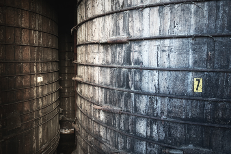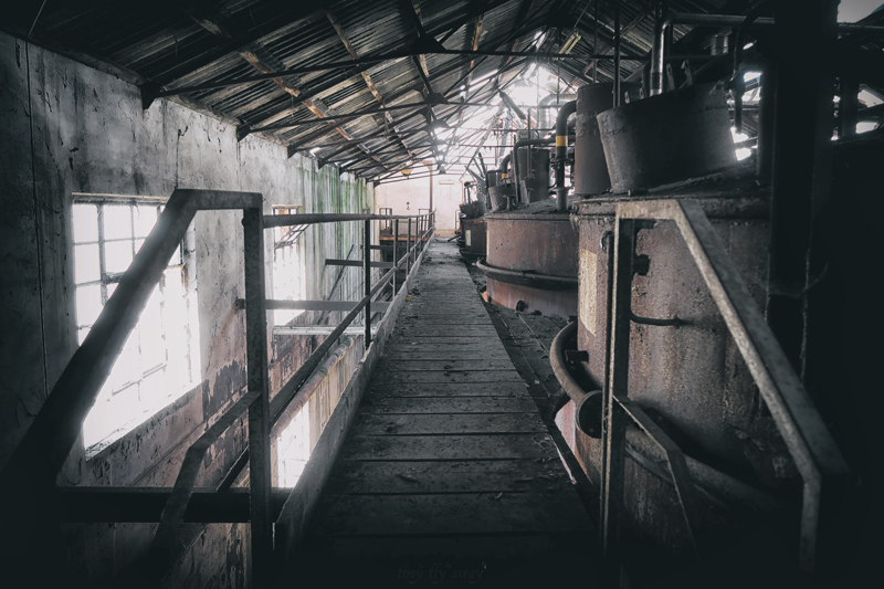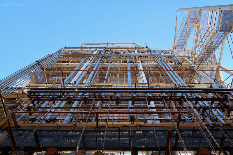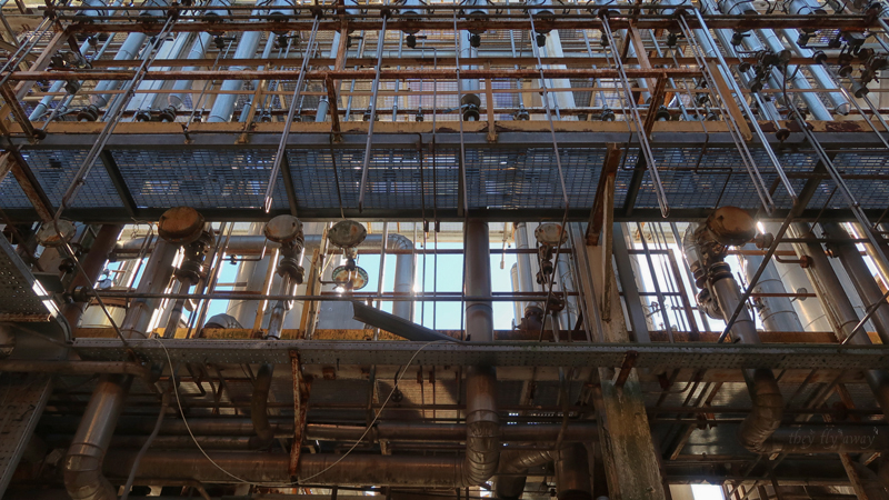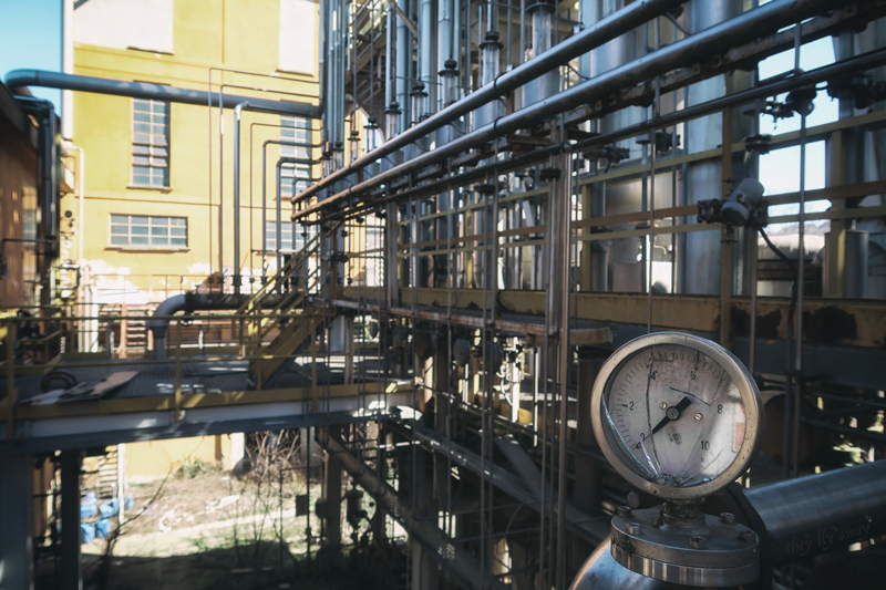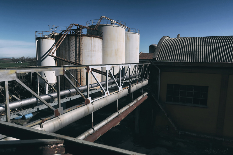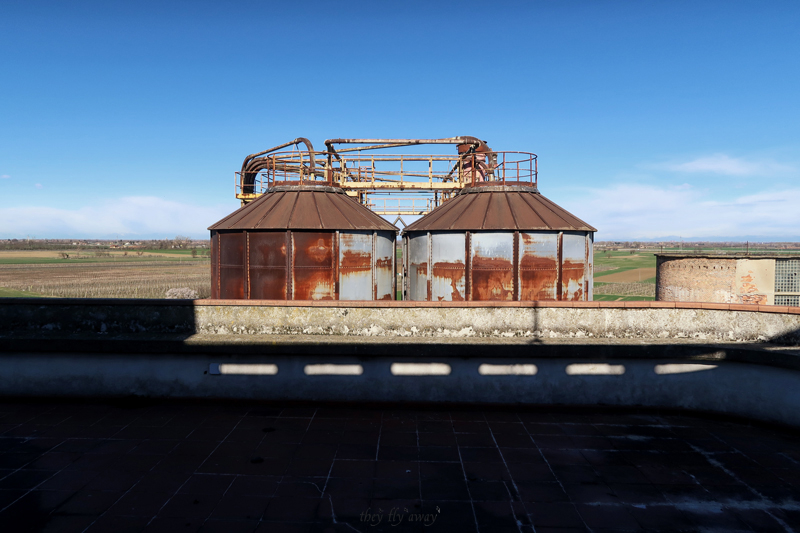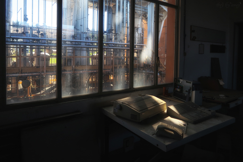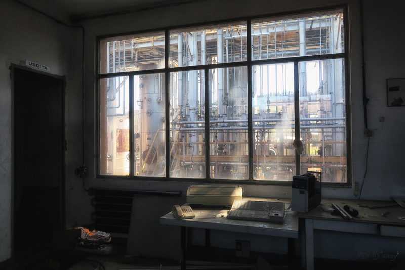 Poi è la volta di una grande stanza dove probabilmente venivano gestiti i processi di distillazione e che comprende anche un piccolo bancone per analisi chimiche. Una porta conduce all’esterno, sulle passerelle metalliche della torre di distillazione. È affascinante guardare tutti quei tubi che si intrecciano, tra gomiti, valvole e manometri. Una porticina mi conduce in un capannone adiacente, per la precisione su una passerella di legno a diversi metri dal suolo, che affianca la cima di grandi serbatoi metallici.