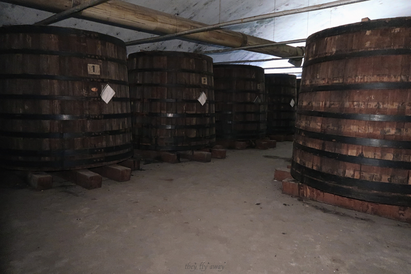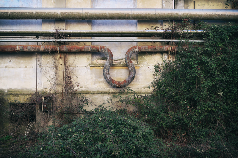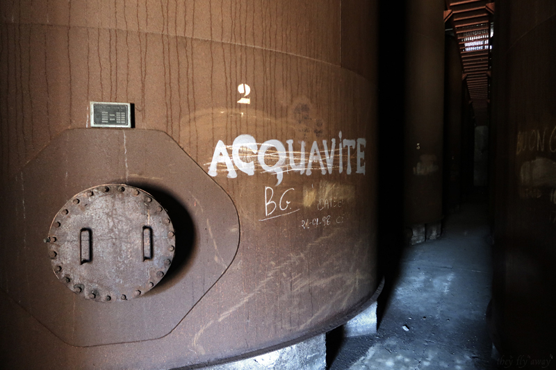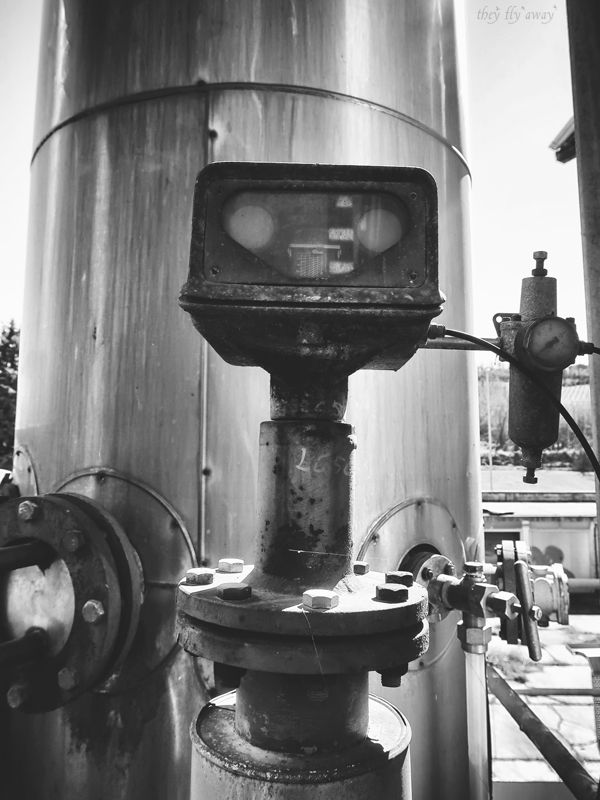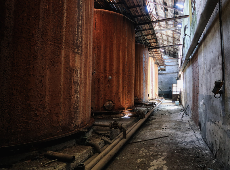 Sul lato di un edificio c’è una porta metallica aperta. Ho trovato l’origine principale dell’odore di alcool. Il “magazzino fiduciario alcool” contiene quattro enormi serbatoi, che giacciono in una piscina di acqua (forse) e alcool. L’odore è insopportabile e mi allontano velocemente. Ovunque mi giri vedo serbatoi e silos di forme e dimensioni differenti. Lungo la facciata di alcuni capannoni corrono dei grossi tubi, tra cui uno del vapore con una delle classiche curve “omega”.