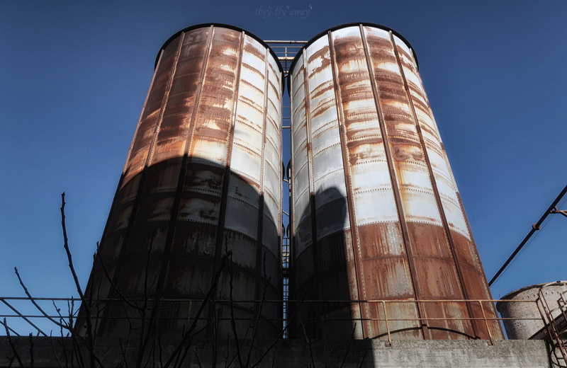 Arrivo su di un alto terrazzo proprio di fronte alla cima di alti silos arrugginiti che si stagliano di fronte alle campagne circostanti; sono al riparo dalla vista e ne approfitto per riposarmi un po’ mangiando del cioccolato.