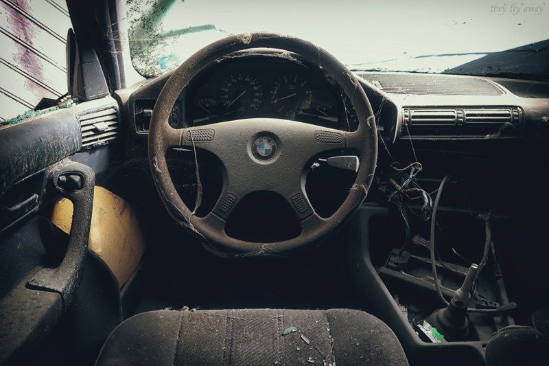 Proseguo verso l’estremità dell’area e dopo l’ennesimo locale contenente botti di legno ovali, mi imbatto in un’officina che ospita un muletto, un’altra piccola pala gommata e una vecchia BMW mezza smontata.