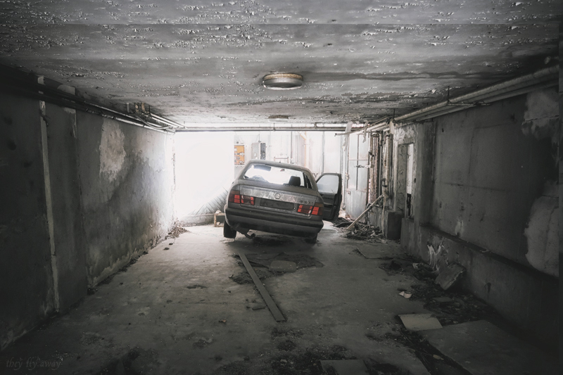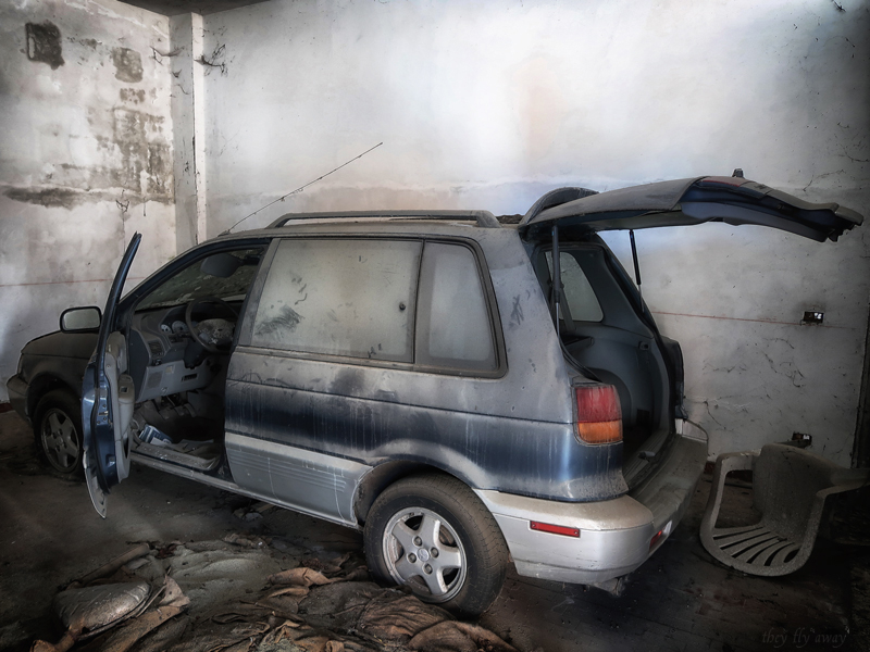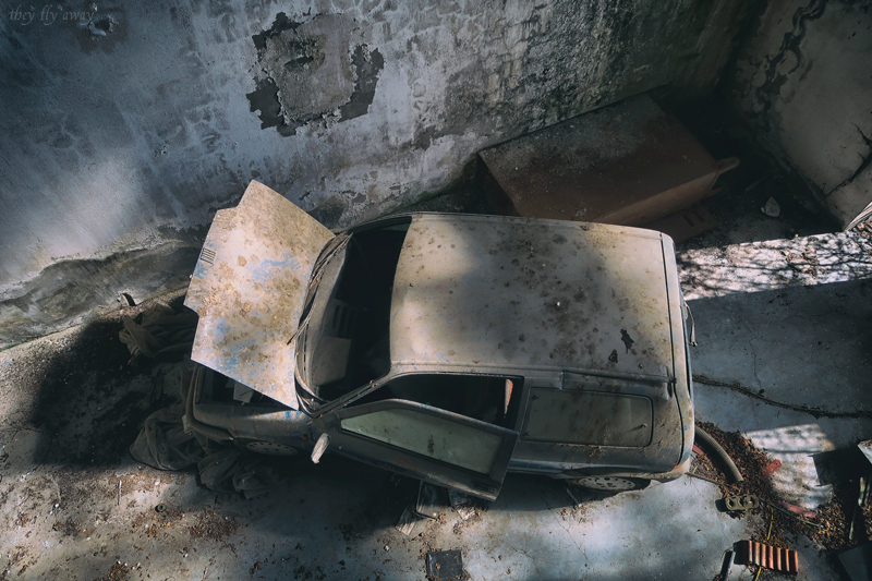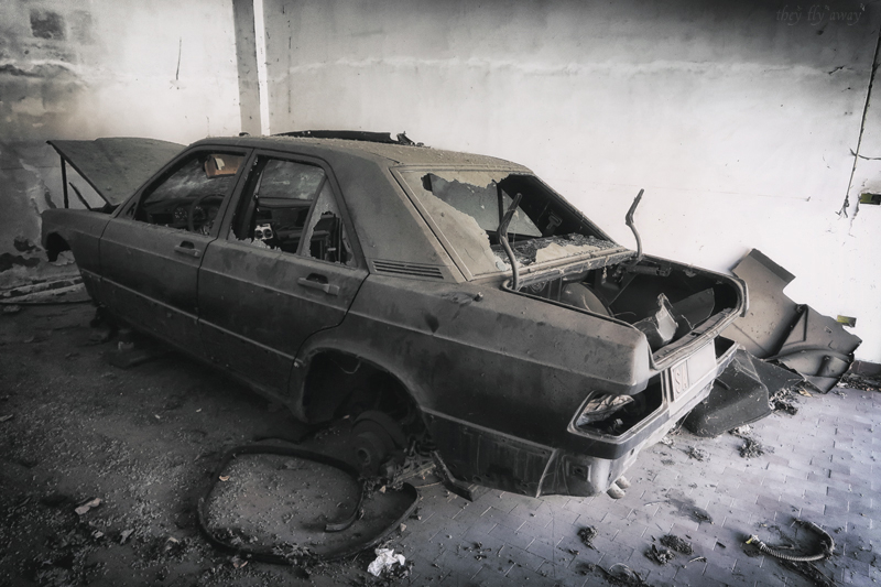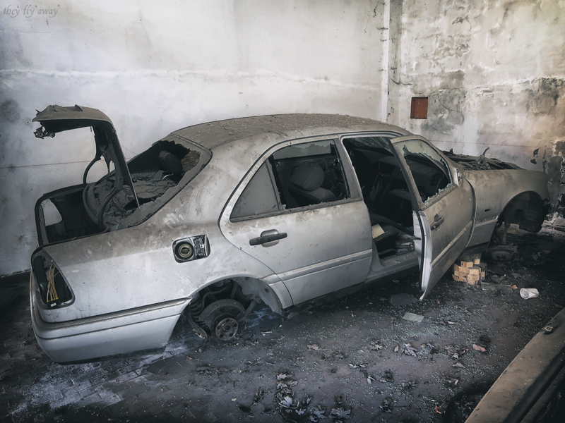 Proseguendo a destra dell’infermeria ci sono dei garage, che con mio stupore scopro essere ancora occupati. All’interno trovo una Mitsubishi Space Runner e una lancia Dedra apparentemente ancora in discrete condizioni, perlomeno non smontate o cannibalizzate come invece sono le due Mercedes nei garage attigui.