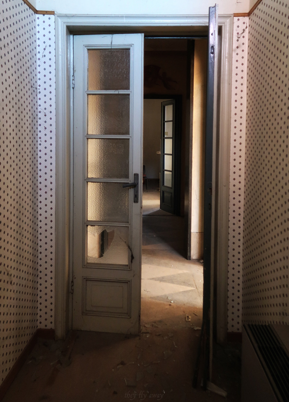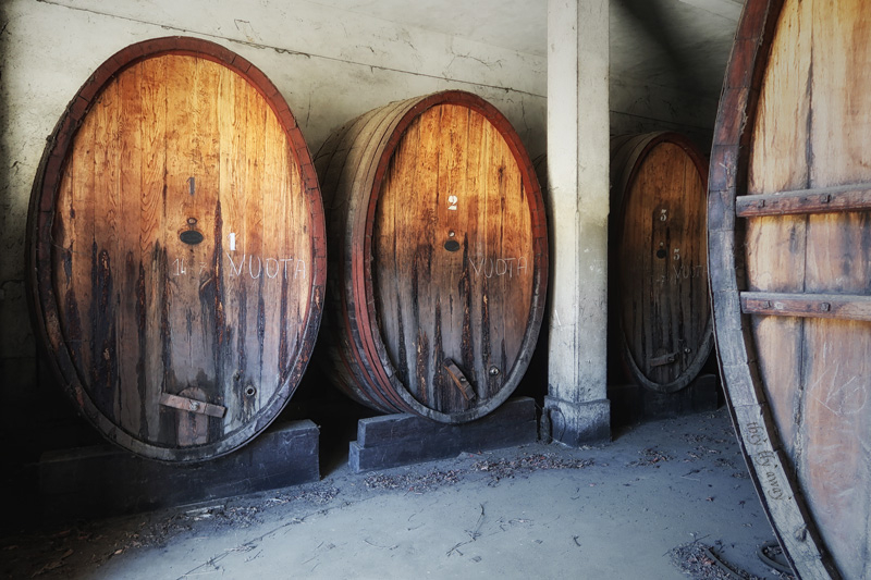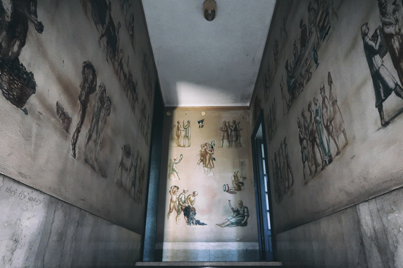 Mi addentro in altri capannoni dove giacciono macchinari, attrezzature e molti grossi tini di legno. Poi arrivo dietro alla palazzina degli uffici, dove sul muro rimane ancora la timbratrice e i porta-cartellini dei dipendenti. A pochi metri di distanza c’è una vecchia BMW serie 5 vandalizzata e parzialmente depredata di qualche pezzo. La palazzina degli uffici, dallo stile esterno marcatamente anni ’30, ha una scalinata interna decorata con dipinti raffiguranti persone che raccolgono l’uva, la trasportano e che poi consumano il prodotto finale, ossia il vino. Alcuni locali si sono conservati meglio di altri, sono rimasti parecchi arredi e oggetti, anche se i vandali hanno fatto parecchi danni, come ad esempio usare le bombolette di vernice su mobili di pregio.