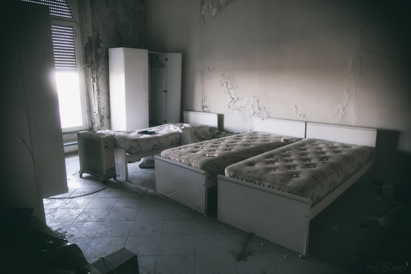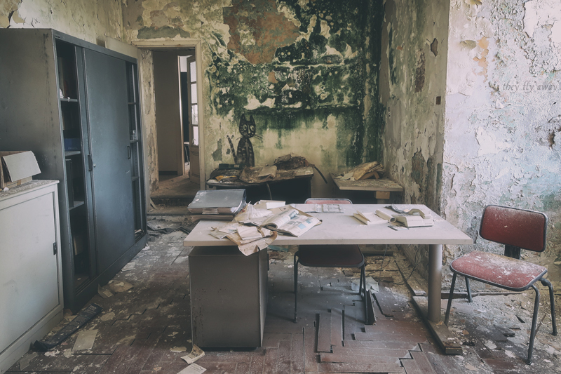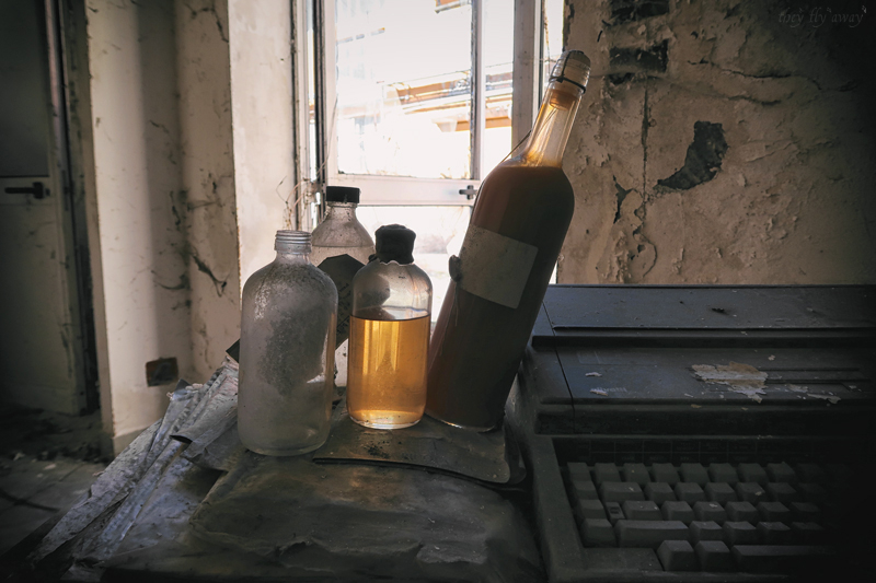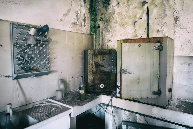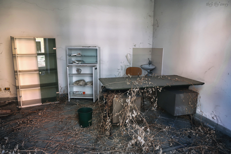 Ritorno al livello del suolo e trovo un’altra piccola pala gommata e altri fusti metallici e di plastica, ancora pieni di non so quali liquidi. Attraverso il piazzale ed entro negli edifici bassi che sull’altro lato si affacciano sulla strada. Il primo locale che trovo sembra essere l’infermeria, dove ci sono ancora le classiche vetrinette per i medicinali e un piccolo lavandino in un angolo; una pianta rampicante ormai secca ha iniziato ad avvolgere la scrivania del dottore.