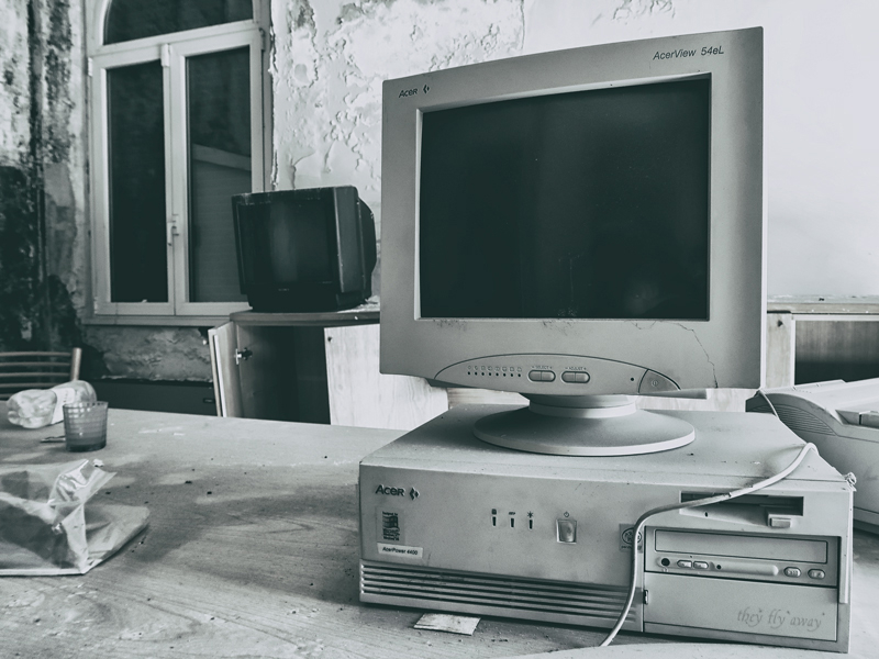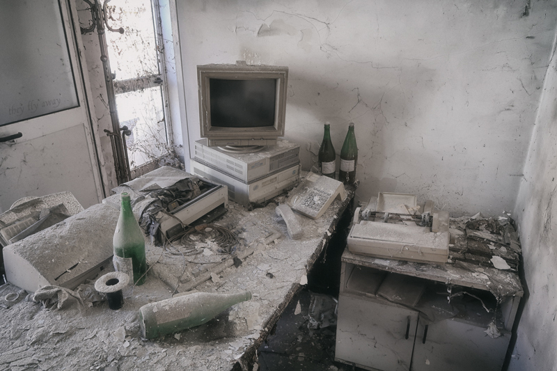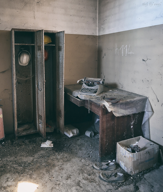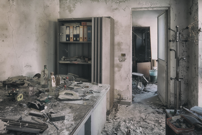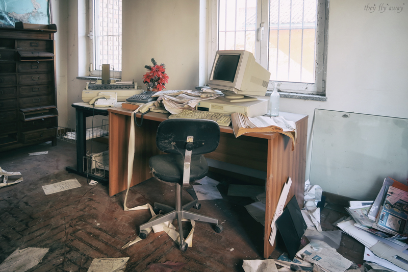 Tornando verso la palazzina direzionale, ma dal lato opposto del piazzale, c’è una palazzina bassa che contiene altri uffici. Le scrivanie, gli armadi, sono ancora pieni di oggetti, tra cui numerose bottiglie – alcune sigillate -, vecchi computer, stampanti e telefoni ricoperti da intonaco sfarinato.