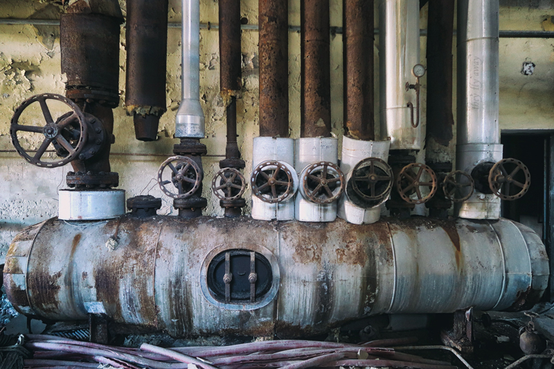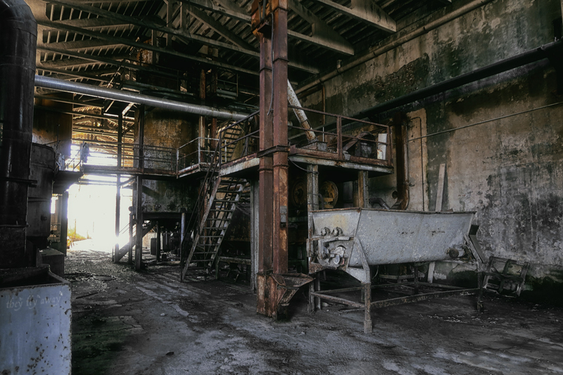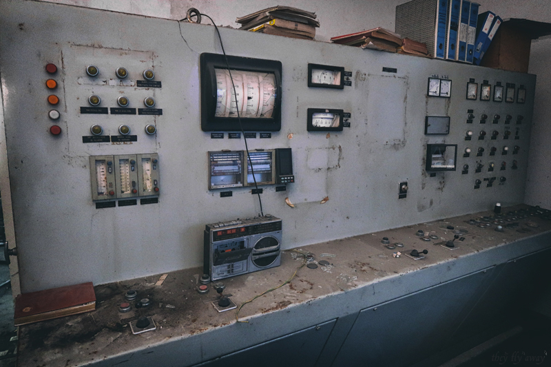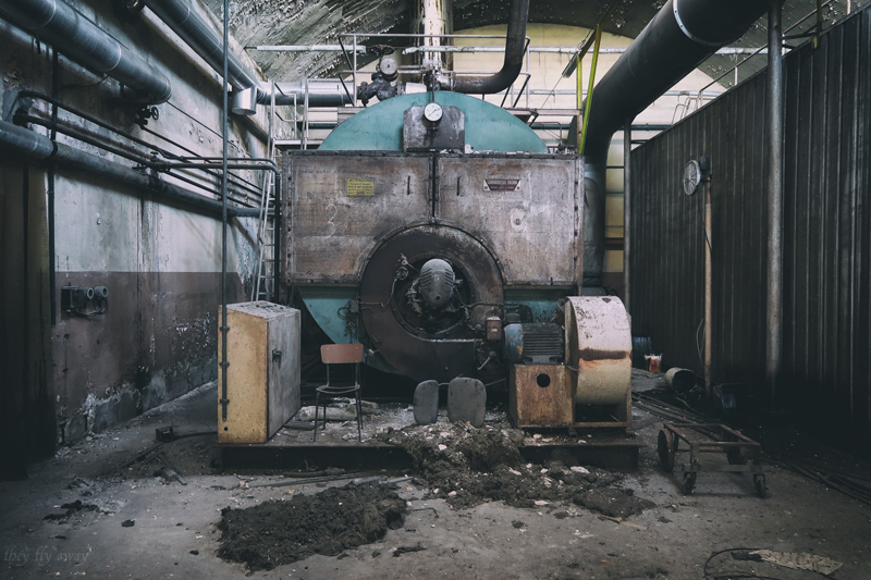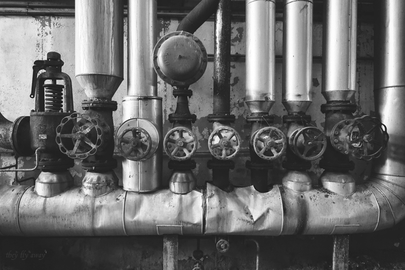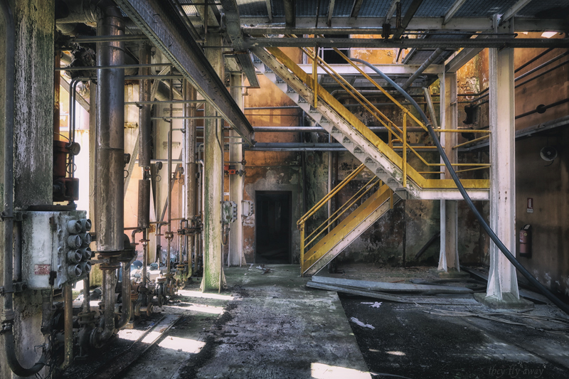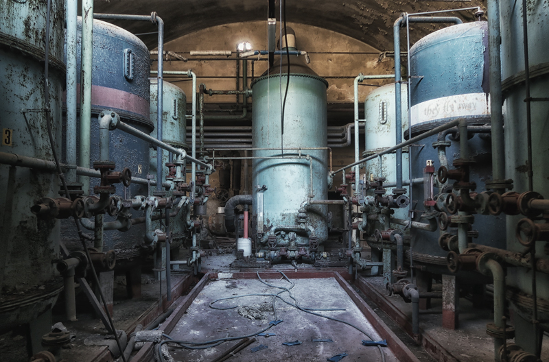 Esplorando questi grandi ambienti trovo ancora molti macchinari, nastri trasportatori, caldaie, una sala di controllo. Trovo anche un piccolo laboratorio chimico con boccette di reagenti, probabilmente per controlli eseguiti sull’acqua impiegata nelle lavorazioni. Ci sono poi locali con serbatoi per l’acqua, caldaie, pompe e decine di tubazioni con valvole per la distribuzione del vapore.
