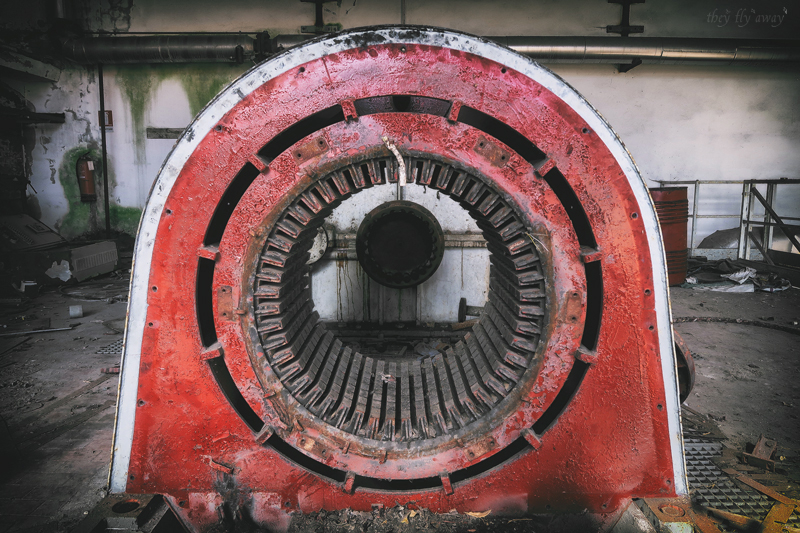 Mi imbatto in un altro mezzo abbandonato, una Fiat Cinquecento blu con il logo della ditta sulle portiere e priva di volante, parabrezza e chissà quanti altri pezzi. Al livello superiore dello stesso capannone ci sono i resti di un generatore di corrente, probabilmente la turbina al quale era collegato veniva mossa da parte del vapore generato dalle caldaie viste in precedenza.