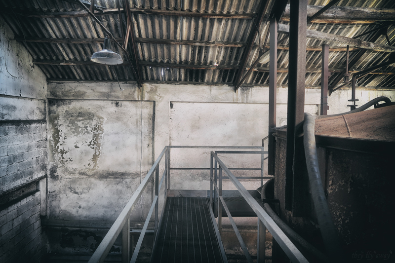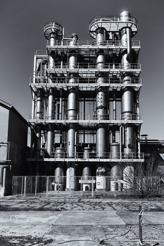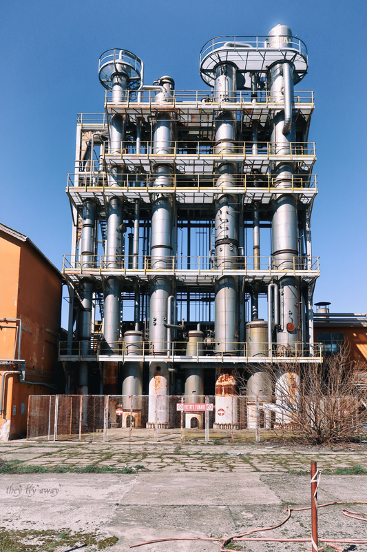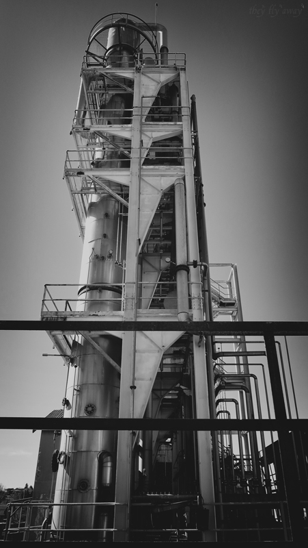 Dopo aver attraversato un altro capannone contenente enormi serbatoi metallici arrugginiti, arrivo ai piedi delle alte torri di distillazione. La tentazione di salirci è molto alta ma so che non lo potrò fare perché sarei in piena vista dalla strada che corre davanti alla distilleria.