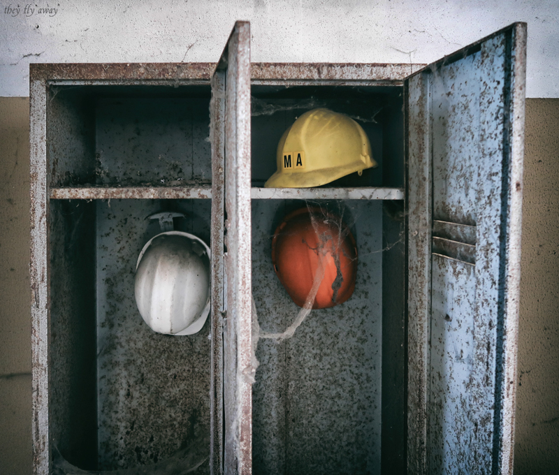 Entro quindi nell’edificio adiacente che contiene diverse scalette metalliche che mi portano quasi alla stessa altezza delle torri. Da un balconcino, nascosto dalla vista dalla strada, ho un panorama su tutti i tetti dei capannoni, un “trionfo” dell’eternit, fatto di crolli, buchi, di lastre spezzate, cedute e spostate ovunque. Ridiscendo e trovo un passaggio per arrivare nell’edificio proprio alle spalle delle torri di distillazione. Qui ci sono degli spogliatoi dei lavoratori, con un armadietto ancora contenente i caschetti protettivi.
