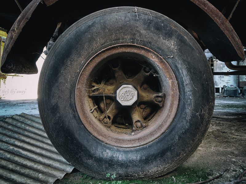 Scendo nuovamente tra i capannoni. Mi colpisce un rimorchio piuttosto vecchio, con cerchioni marchiati Breda e con le frecce posteriori proprio a forma di… freccia.
