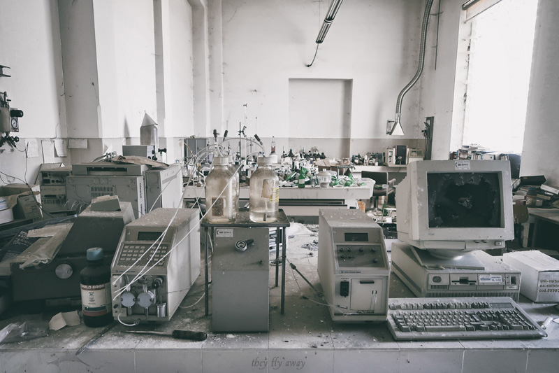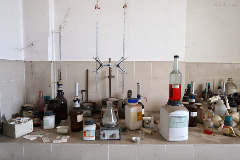 Attraverso nuovamente il piazzale ed entro in un grande laboratorio chimico che appare incredibilmente semi-intatto e non vandalizzato. Ci sono ancora decine di provette, bottiglie, pipette in vetro che di solito sono le prime cose ad essere lanciate in giro e distrutte. Alcuni contenitori sono ancora pieni di liquidi non meglio identificati e i banconi sono cosparsi di confezioni di reagenti e prodotti chimici. Quando esco noto altre due auto aziendali nel piazzale, una vecchia Fiat Tipo rossa e una Fiat Panda grigia, anch’essa col logo della distilleria sulle portiere.