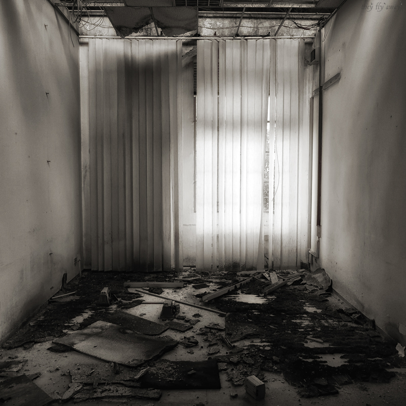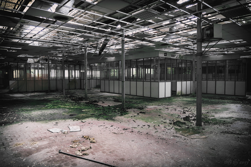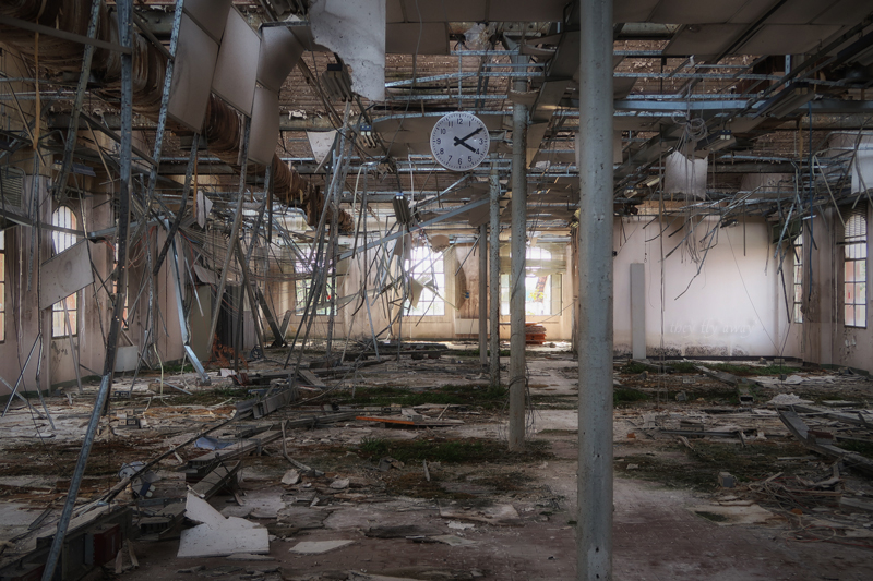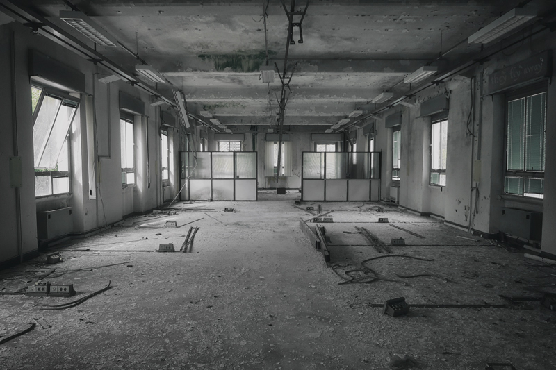 Oltre questa zona, dove anche i bagni erano piastrellati con materiali di pregio, raggiungiamo un altro grande open-space con un altro orologio, questa volta quadrato, collassato per terra insieme a buona parte del controsoffitto.