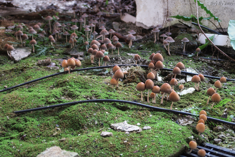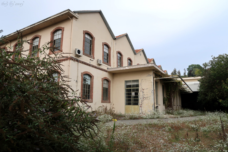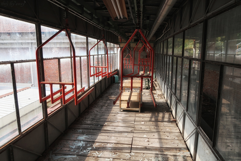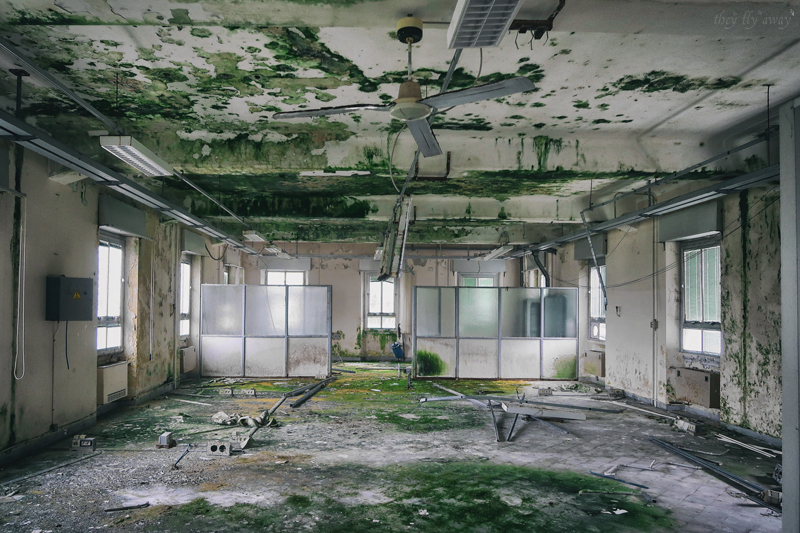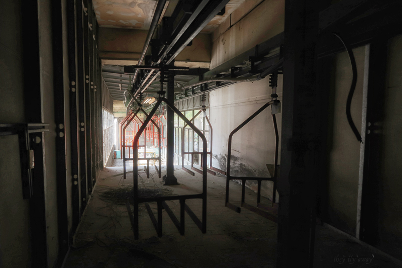 Arriviamo ad una specie di ponte che collega due edifici; all’interno, sul soffitto c’è un binario di andata e di ritorno a cui sono appesi delle specie di seggiolini di una seggiovia, appunto. Probabilmente su questi supporti viaggiavano i prodotti da un reparto all’altro durante la lavorazione. Il passaggio in fondo a questo ponte è stato murato, quindi proseguiamo fino a trovare la zona degli uffici della direzione. Lo capiamo dalla scala con la ringhiera in ferro battuto e corrimano in legno, dal parquet sul pavimento e i condizionatori d’aria nelle stanze. In uno dei locali il tetto è crollato e sui detriti sono cresciuti dei bellissimi funghetti!