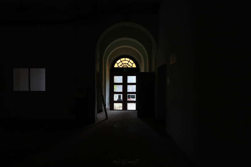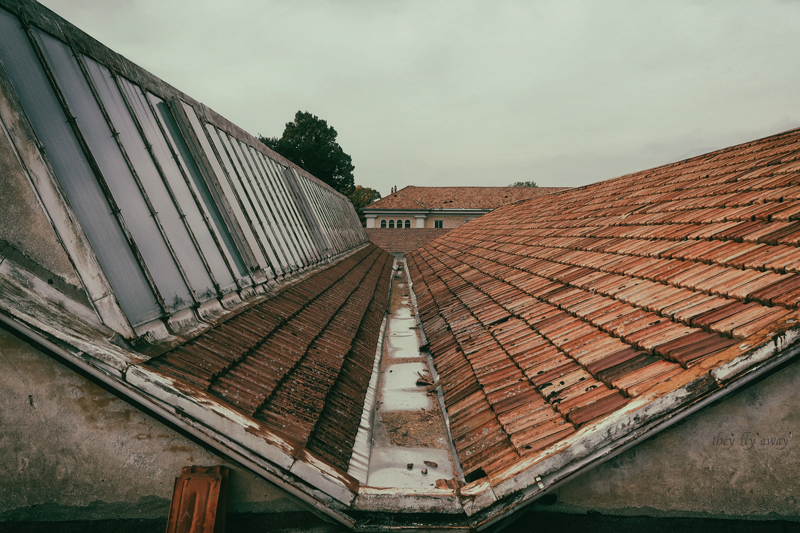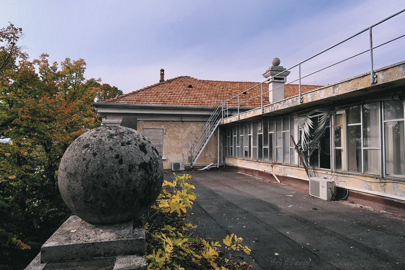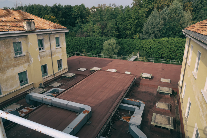 Dobbiamo raggiungere l’edificio più a ovest, quindi passiamo davanti alla centrale idroelettrica in silenzio sperando che non uscisse nessuno proprio in quel momento. Arriviamo davanti all’edificio, che è una grande palazzina di tre piani simile ad una grande villa. Le porte di ingresso sono in legno con un bel lucernario a mezzaluna con vetri gialli. Troviamo aperto così saliamo le scale per iniziare l’esplorazione dall’alto, come al solito. La palazzina è a forma di “U” e in un’epoca successiva alla costruzione è stato aggiunto un edificio basso di un piano nel cortile. Dall’alto si vedono i lucernari e le condutture dell’aria condizionata. Sul lato frontale invece ci sono due gradi terrazzi, il parapetto e i camini sono decorati con grosse sfere di cemento.