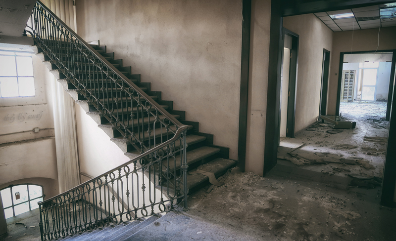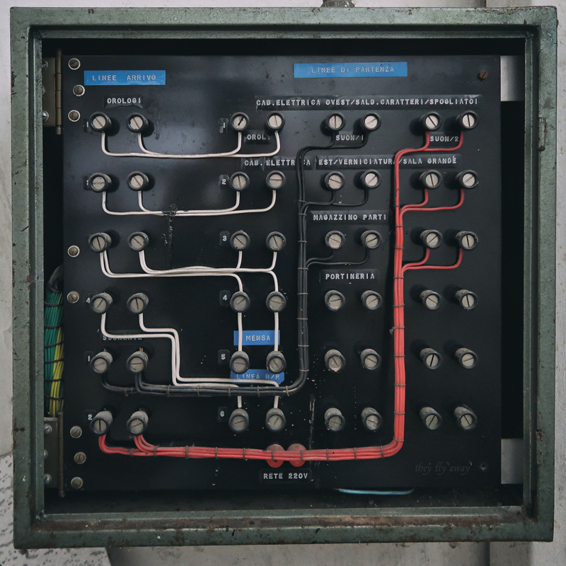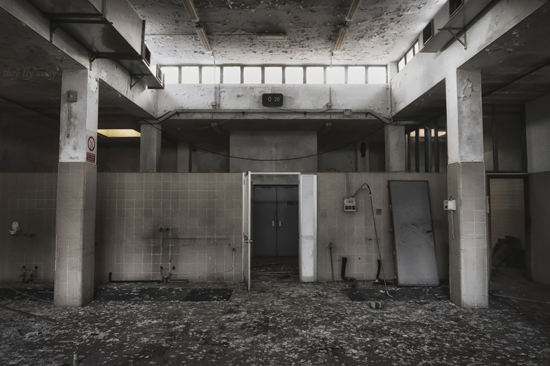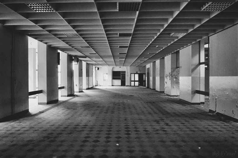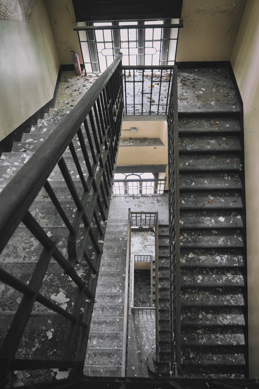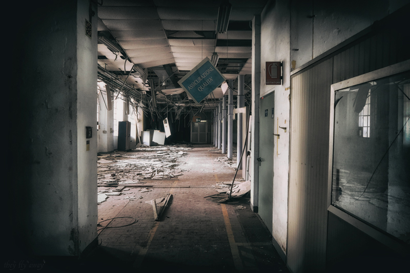 I piani alti della palazzina non sono molto interessanti, anche qui c’erano solo uffici e i locali sono tutti completamente vuoti. Purtroppo anche qui gli ambienti furono “modernizzati” con l’adozione di pareti in cartongesso, lampade al neon e torrette elettriche sul pavimento. In compenso qui la devastazione è molto minore rispetto al primo edificio, c’è solo l’intonaco caduto dal soffitto a causa dello scorrere del tempo.