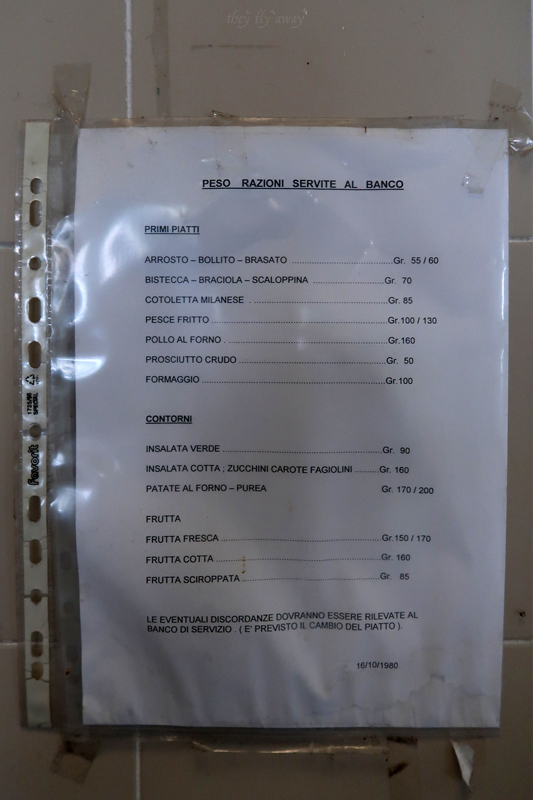 Al piano terra, nell’edificio basso nel cortile c’era la mensa per i lavoratori. Sul soffitto sono rimasti i cartelli che erano sopra i banchi del buffet ad indicare la zona “Primi” e “Secondi”. Trovo anche un foglio ancora attaccato al muro con le quantità di cibo che dovevano essere servite per ogni tipologia di cibo, risalente al 1980. I locali che ospitavano le cucine, piastrellati, sono purtroppo vuoti e rimane di interessante solamente un vecchio orologio a palette. Anche gli altri locali sono vuoti, quindi ci riposiamo un po’ prima di uscire e tornare sui nostri passi.
