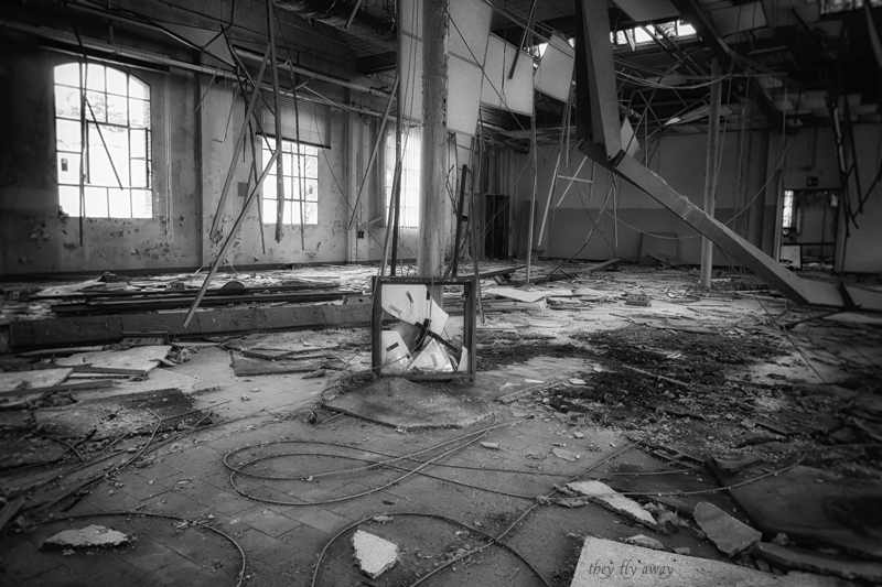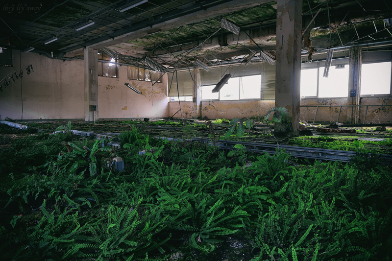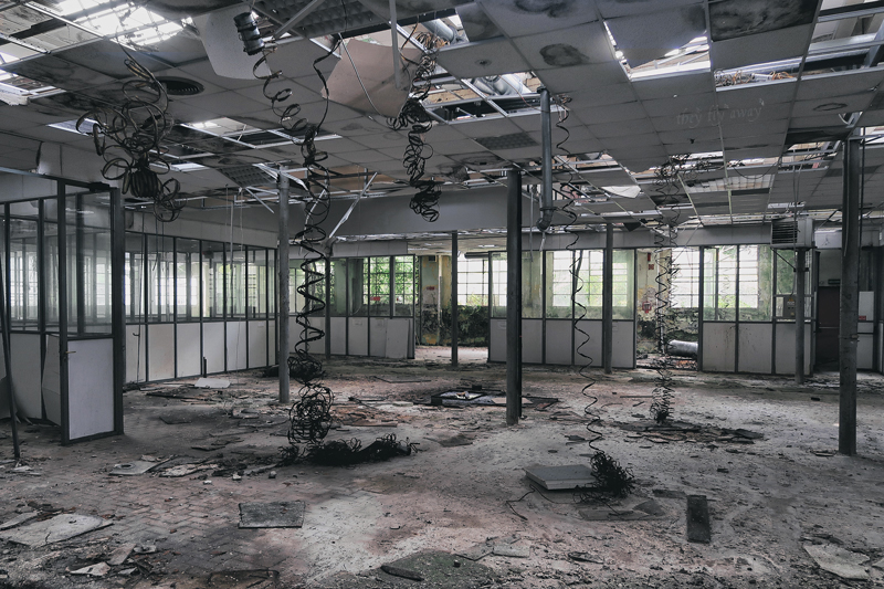 Io e il mio fido compagno MD venivamo da una lunga e bellissima esplorazione industriale, che era l’obiettivo principale della giornata. Dopo aver bevuto un caffè in quello che potrebbe essere uno dei bar più malfamati di Caracas, senza essere a Caracas, ci avviamo verso la fabbrica. Dopo una veloce ricognizione ci accorgiamo che l’ingresso all’area è molto molto più semplice del previsto. Non riusciamo però ad entrare nell’edificio, sembra che tutto sia stato chiuso a seguito di una bonifica dall’amianto. Fortunatamente la nostra caparbietà nella ricerca viene ripagata e troviamo la nostra entrata. Saliamo delle scale e ci troviamo in grandi locali vuoti, dove i controsoffitti sono collassati a terra, facendo da terreno fertile per distese di felci che sono cresciute rigogliose in mezzo alle torrette elettriche. Oltre alle ovvie infiltrazioni d’acqua molte cose sono state smontate con veemenza per ottenere questa situazione.