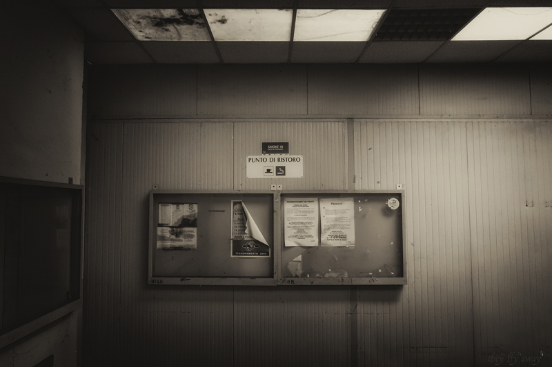 Fa sorridere anche una stanzetta “punto di ristoro” dove i lavoratori potevano bere il caffè (probabilmente c’erano dei distributori automatici) e fumare. Una stanza dotata di aspiratori, unica zona franca per i fumatori nella fabbrica che non facciamo fatica ad immaginare si tramutasse in una specie di camera a gas. Sulle pareti ci sono ancora le bacheche dei sindacati con avvisi risalenti al 2004.