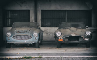 Ottobre 2024. Vecchie glorie inglesi parcheggiate da molto tempo in un piazzale, fotografate dalla strada.